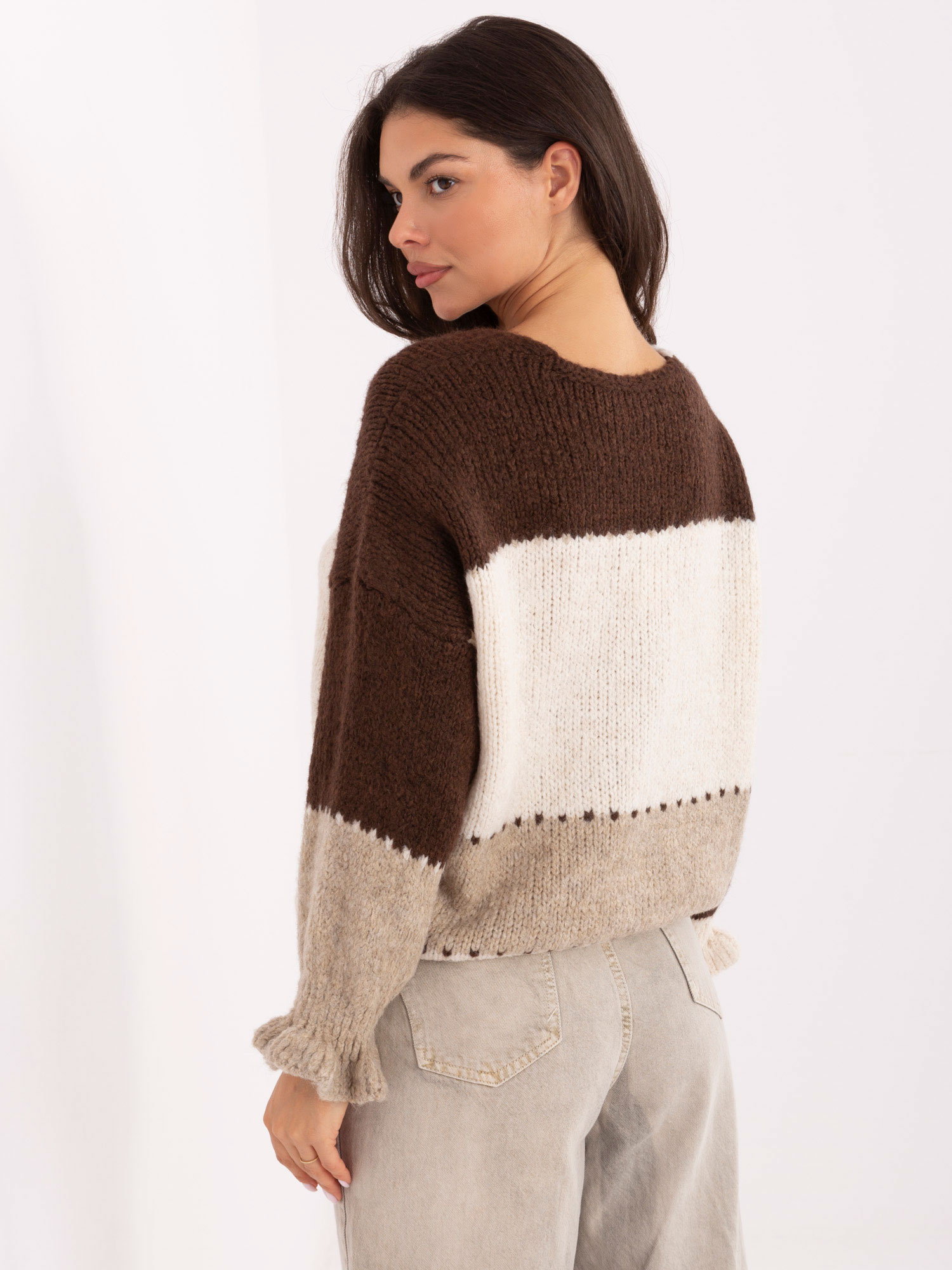 Modelis dėvi vieno dydžio dydį. Modelio matmenys: Aukštis 173 cm, krūtinė 85 cm, juosmens 62 cm, klubai 95 cm.