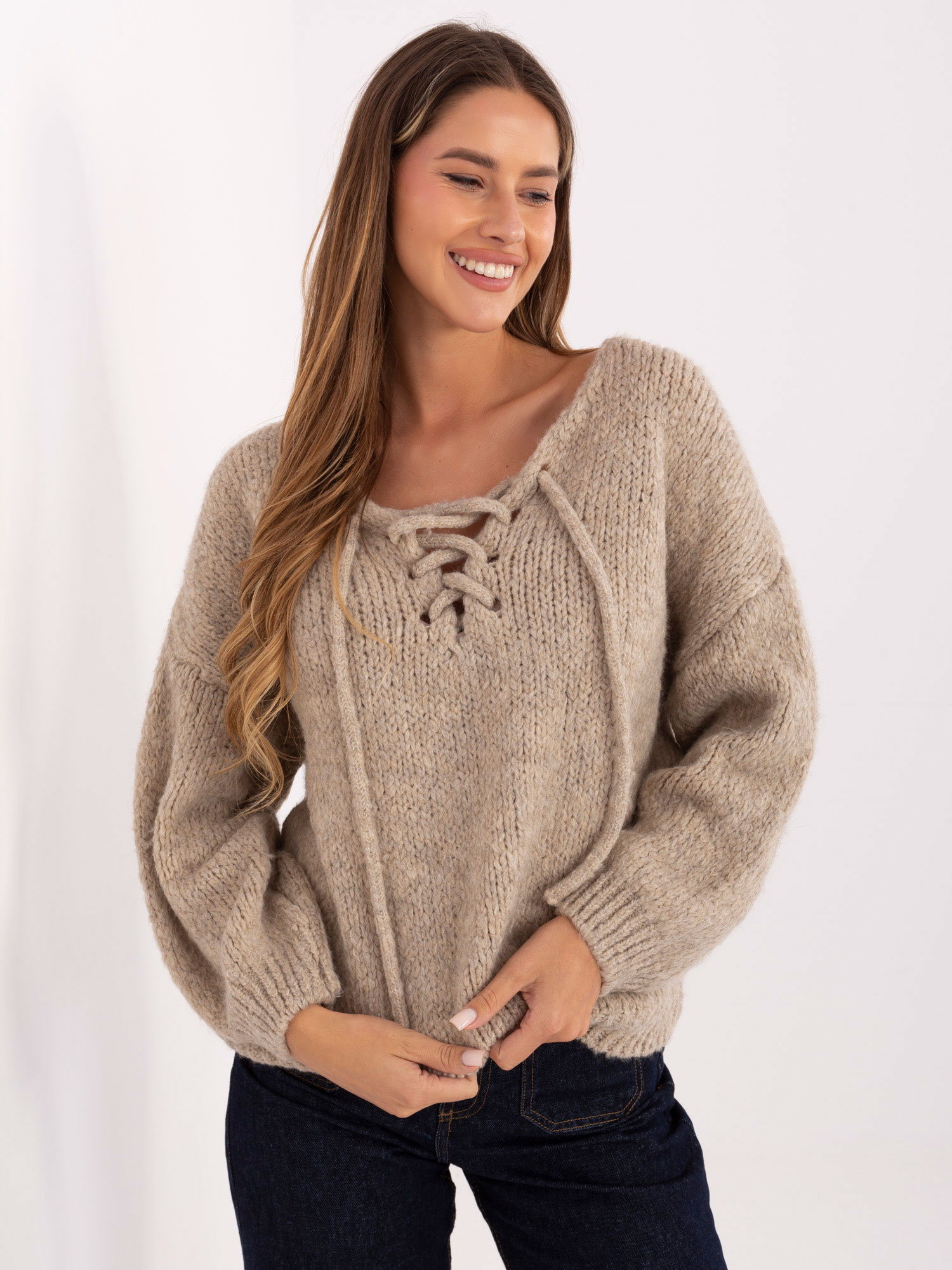 Vieno dydžio megztinio matmenys: plotis pažastyje - 68 cm, bendras ilgis - 69 cm, rankovių ilgis - 44 cm (nuo siūlės), klubų plotis - 51 cm.