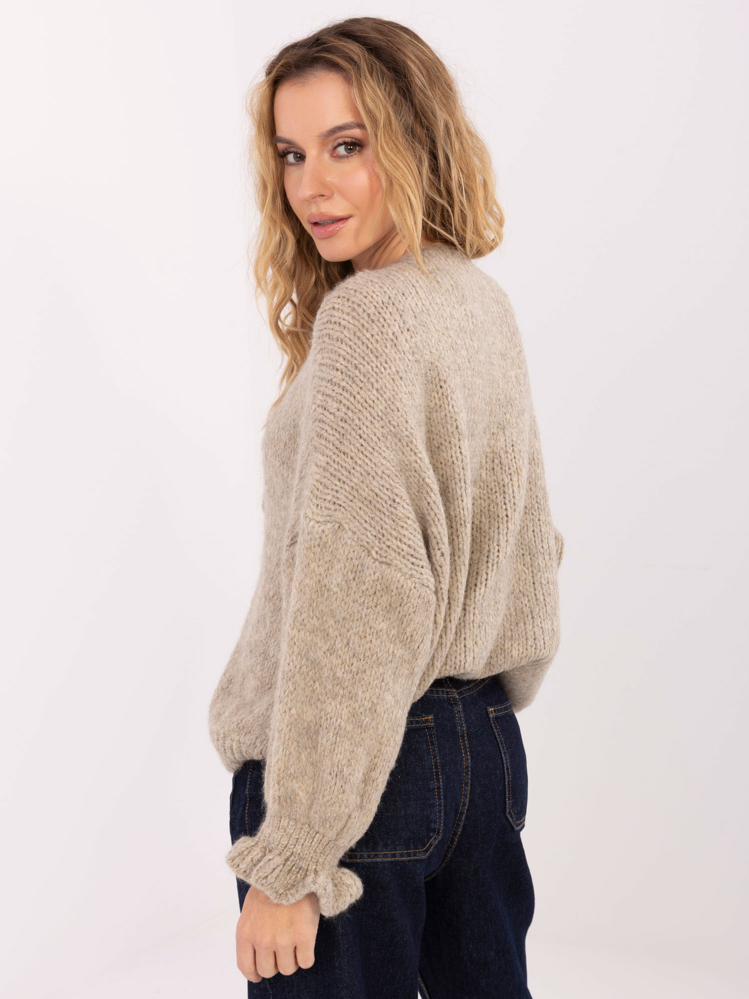 Vieno dydžio megztinio matmenys, matuojamas plokščias: pažasties plotis - 63 cm, rankovių ilgis - 46 cm, bendras ilgis - 64 cm.