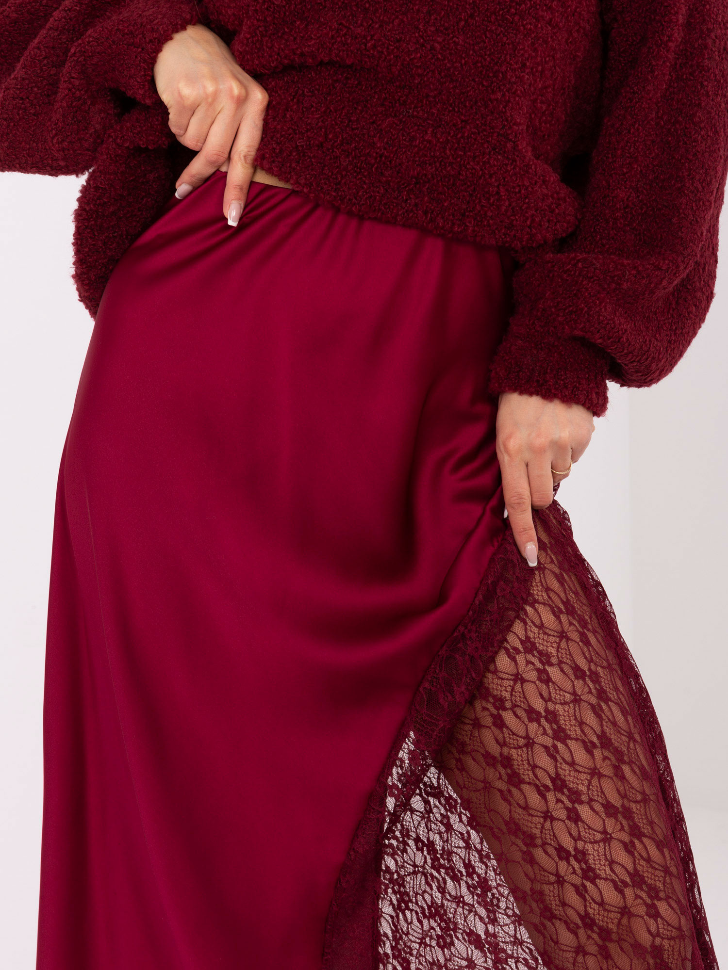 Vieno dydžio sijono matmenys: juosmens plotis – 32 cm (plokščias), juosmens plotis – 42 cm (ištempus), klubų plotis – 54 cm, bendras ilgis – 92 cm.